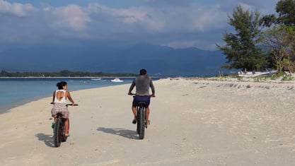 A Gili Trawangan é a maior das três ilhas. E apesar desse título, levamos apenas uma hora para rodar por ela de bicicleta. É uma ilha agitada, com vários jovens procurando festas e diversão. Há restaurantes por toda a praia. E por aqui tivemos a oportunidade até de assistir uma sessão de cinema na areia.