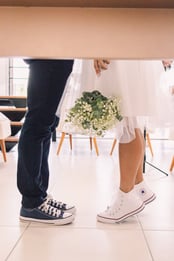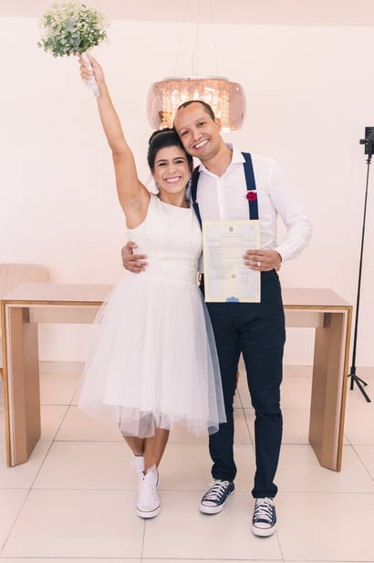 Para o dia do nosso casamento queríamos algo simples e intimista, sem o glamour das festas tradicionais. Por isso, nos casamos apenas no civil, com a presença de nossa família. Contratamos uma fotógrafa para registrar o momento, e escolhemos roupas que refletiam nosso estilo pessoal. Depois da cerimônia, reunimos nossa família para um almoço juntos.