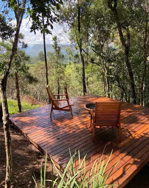 Convidamos os casais a descobrir este lugar único, onde cada momento é uma experiência visual inesquecível. Ao despertar, a beleza da natureza se desdobra diante de seus olhos através da porta de vidro do quarto. Durante o banho, mais uma vez, uma paisagem encantador o aguarda, convidando-o a relaxar ainda mais. Quando chega a hora de preparar um churrasco ou um jantar especial, a conexão com a natureza é ainda mais intensa, graças às belas janelas e portas de vidro que permitem desfrutar dos arredores. se desejar sair um pouco da cabana, nosso deck maravilhoso, equipado com uma lareira e duas poltronas de jardim, oferece um espaço perfeito para desfrutar do ambiente exterior.